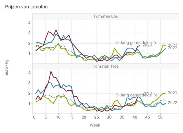 El precio medio de tomates en rama en las subastas de la Federación de Cooperativas Hortícolas Belgas (VBT) subió la semana pasada hasta alcanzar un valor justo por debajo de 2 €/kg, siendo más alto que el precio medio del mismo período del año pasado, cuando las cotizaciones ya llegaron a cotas bastante elevadas. Los precios de los tomates sueltos también estuvieron subiendo en la semana 42, aunque a un ritmo más lento.