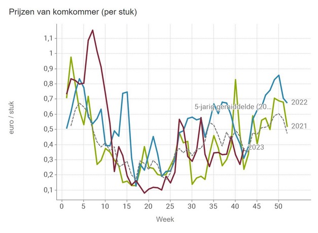 Al final de la temporada de hortalizas de invernadero, los precios medios del pepino y el pimiento también volvieron a aumentar en la semana 42. El pepino registró un precio igual a la media de los últimos 5 años: 37,9 céntimos de euro por pieza.