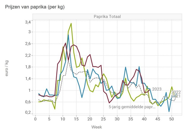 En el caso de los pimientos, el precio medio, teniendo en cuenta todos los colores, fue de más de 1,03 €/kg, un valor comparable al del año pasado, pero muy por encima de la media de los últimos 5 años.