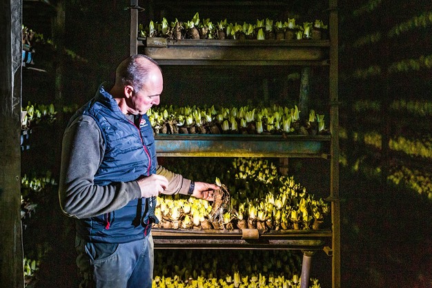 Los horticultores del SICA cultivan raíces de endibia en campo abierto para diversificar sus rotaciones de cultivos con una cosecha corta (de mayo a noviembre/diciembre). A continuación, las raíces se transportan a las instalaciones de producción, donde se colocan en cámaras de crecimiento antes de ser cosechadas en el taller de envasado. Todas las operaciones están coordinadas por SICA.