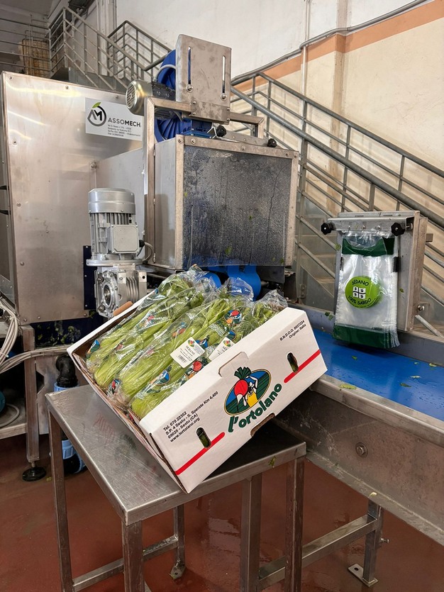 En estas últimas semanas, el fabricante italiano de líneas de procesamiento Assomech ha instalado en el almacén de la empresa de cultivo sarda L'Ortolano di Sestu una línea de corte y envasado que permite trabajar más volúmenes de apio con menos personal. "La empresa sarda, a través de su director Salvatore Pisanu, nos contactó porque quería mejorar sus rendimientos en el procesamiento del apio. Después de haber evaluado la solicitud, decidimos fabricar una línea a medida", explica Peter Calisesi, gerente de Assomech.