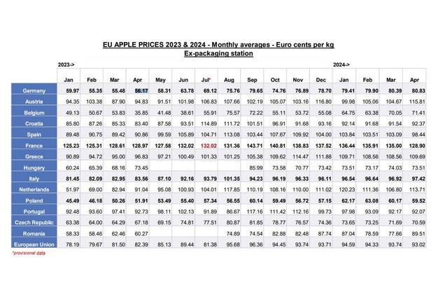 Los precios medios mensuales de la manzana a la salida de almacén fueron de 128,9 € en Francia, 80,83 € en Alemania, 98,44 € en España y 92,07 € en Portugal.