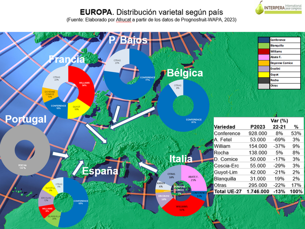 Con una cosecha en 2023 de cerca del millón de toneladas, la Conferencia es la principal pera que se produce en Europa, básicamente en Bélgica, Países Bajos y España.