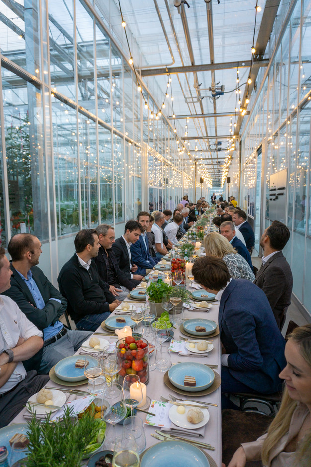Foto de la derecha: Sentados en una mesa de 75 metros de largo, los invitados disfrutaron de una experiencia única que incluía degustaciones de las variedades de tomate de Harmoniz Seeds.
