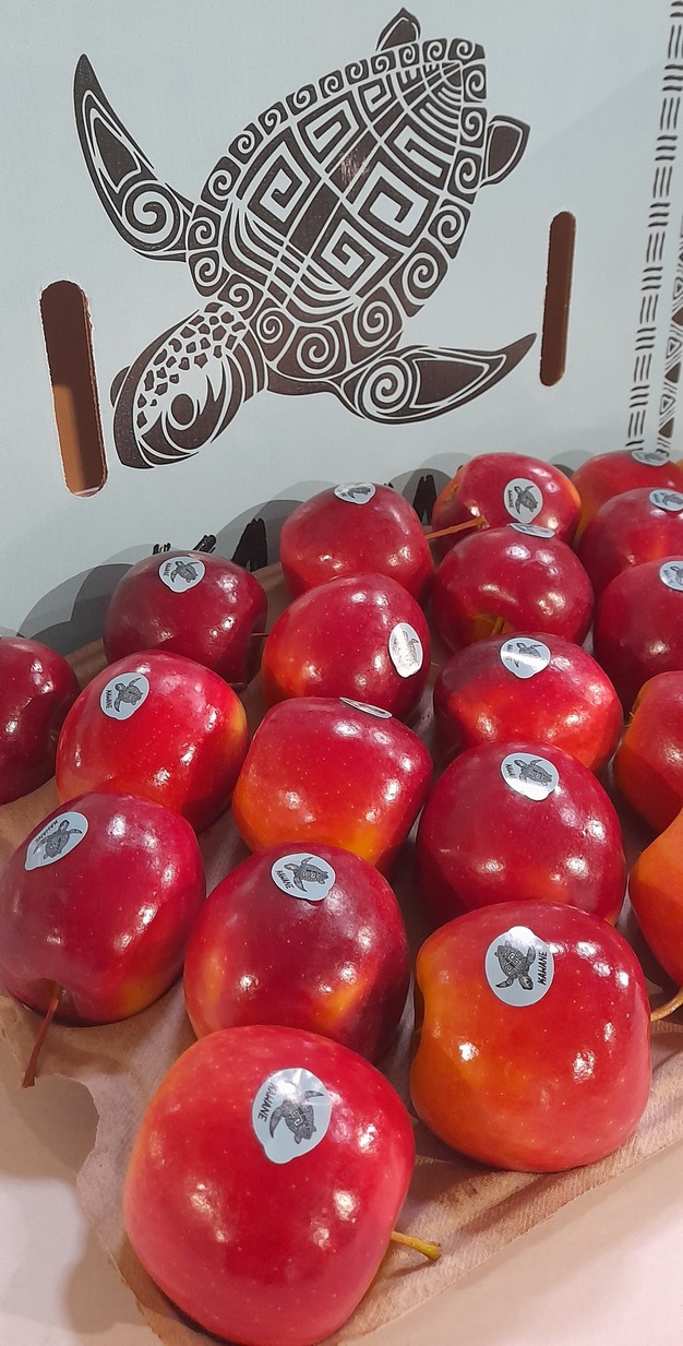 Se ha reflexionado mucho para valorizar esta variedad en los mercados lejanos. "Decidimos llamar Kawane a esta manzana en referencia a la tortuga boba, caouanne en francés, una especie de tortuga marina que actualmente se encuentra en grave peligro de extinción. Las tortugas son discretas (como la política de nuestra empresa), preciosas y recorren los océanos como esta variedad de manzana. Como estamos especializados en productos marinos, nos gustó el paralelismo con la imagen de esta pacífica tortuga surcando los océanos".