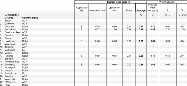 Por el contrario, Costa Rica fue testigo de un notable descenso de los precios de la banana. El precio medio cayó de 0,95 a 0,79 libras esterlinas por kilogramo, lo que supone un descenso de aproximadamente el 17%. Esta caída podría atribuirse al aumento de la oferta o al cambio de la dinámica de la demanda en el mercado internacional.