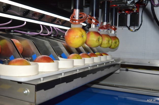 Las llamadas máquinas Aporo dobles ya se usan mucho en centros de envasado de manzanas grandes, sobre todo en Francia e Italia. Estas máquinas permiten procesar grandes volúmenes de fruta (redonda) de manera rápida y sencilla. Por supuesto, también puede integrarse en un entorno de producción ya existente. Junto a la máquina Aporo puede colocarse, por ejemplo, una etiquetadora automática de fruta de Sinclair. Y después, una paletizadora puede completar el proceso de producción.