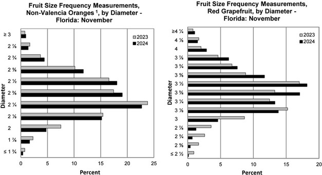La previsión de naranjas en Florida para 2024-2025 publicada por el Consejo de Estadísticas Agrícolas del USDA es de 12 millones de cajas, un 20% menos que la previsión de octubre. Si se cumple, será un 33% menos que la producción final de la temporada pasada.
