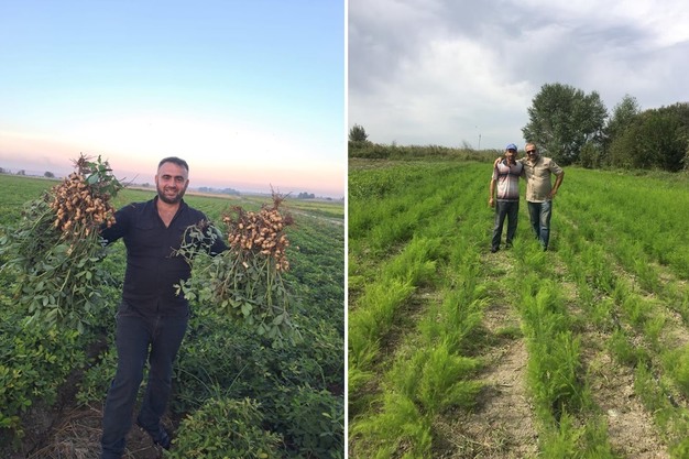 Izquierda: el productor local asociado Cengiz Hashimov, de la plantación de cacahuetes Wasserstein LOPAFA Aghstafa. Derecha: Ayaz Bayramov con el socio y productor local Mukhtar en la plantación de espárragos de Wasserstein LOPAFA.