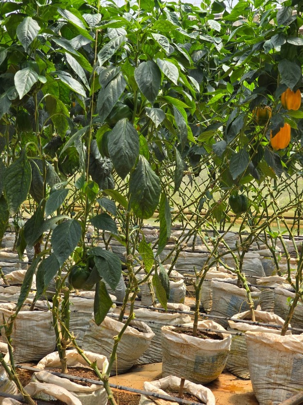 Antes de cada siembra, se emplea maíz seco como fuente de calor para desinfectar el suelo. Los cultivos en invernadero se plantan directamente en tierra, con riego y fertilización administrados mediante sistemas de goteo. Los fertilizantes se aplican en forma granular y también disueltos en el agua de riego. El agua utilizada presenta un pH entre 5,5 y 6,0.