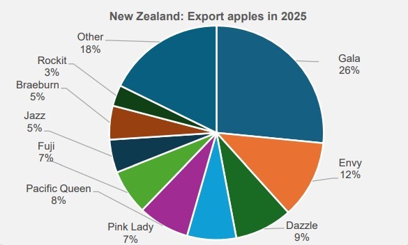 La variedad de manzana que más exporta Nueva Zelanda es, sin duda, la Gala. En 2025, el país envió 110.000 toneladas; una cifra superior a la de los dos años anteriores, pero inferior a la de otros años. Alrededor del 70% de las exportaciones de Gala se destinan a países del sur y el este de Asia.