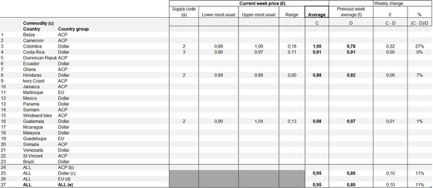 A nivel agregado, las bananas de todos los orígenes ACP alcanzaron una media de 0,95 £ por kg, frente a las 0,85 £ de la semana anterior. Este aumento de 0,10 £ representa una subida semanal del 11%. Las mismas cifras se registraron para todos los orígenes combinados, con una media global también de 0,95 £ por kg, frente a las 0,85 £ de la semana pasada, lo que supone un aumento de 0,10 £ o del 11%.