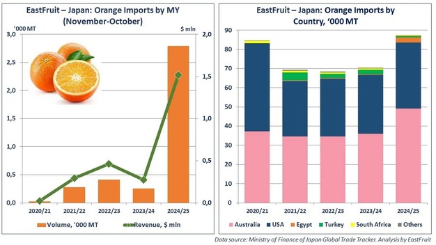Al final de la temporada, Egipto se situó entre los tres principales proveedores de naranjas de Japón, superando a Turquía y Sudáfrica. Esto ocurrió durante un periodo en el que las exportaciones de naranjas egipcias a otros destinos disminuyeron, en parte debido a las interrupciones del transporte marítimo en el mar Rojo y a la mayor demanda interna de los procesadores de zumo.