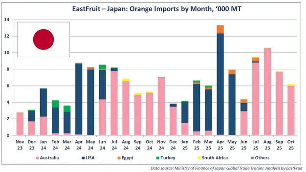 El mercado japonés de la naranja depende en gran medida de las importaciones, ya que la producción nacional cubre menos del 10% de la demanda total. Tradicionalmente, el suministro viene de Australia, de julio a diciembre, y de Estados Unidos, de enero a mayo. Las naranjas egipcias entran en el mercado principalmente entre febrero y julio, lo que las sitúa en competencia directa con ambos orígenes.