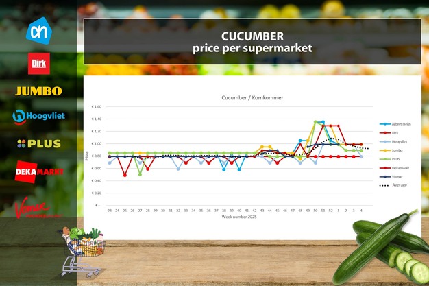 Hoogvliet tiene el producto de oferta. En la semana 4, el precio de sus pepinos ha bajado de 99 a 79 céntimos de euro por unidad. Por lo demás, no hay cambios con respecto a la semana 3. Los precios se mantienen por debajo del euro. Vomar no dispone de pepinos en su web por tercera semana consecutiva.