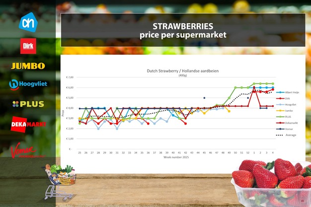 En cuanto al precio de la fresa, no podemos ofrecer una buena comparativa. Desde la semana 1 de 2026, solo Albert Heijn ofrece una variedad de fresa holandesa en envases de 400 gramos (online) y el precio se mantiene en 5,99 euros. Los demás supermercados que tienen fresas disponibles solo ofrecen un formato de 250 gramos, por lo que para comparar con el de 400 gramos hay que llevar a cabo una conversión. Teniendo eso en cuenta, el precio en Dirk ha aumentado 23 céntimos de euro. El precio medio semanal asciende a 5,75 euros.