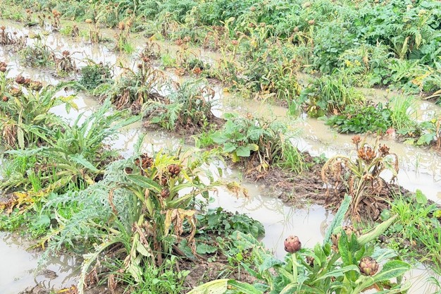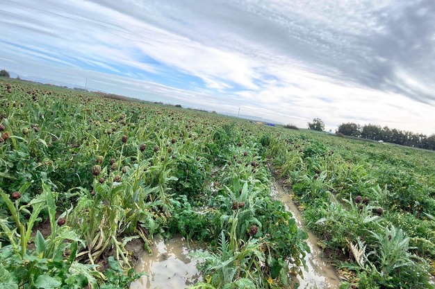 "Los campos de alcachofas están saturados de agua y son difíciles de gestionar. El reciente paso del ciclón Harry puede definirse como la gota que colmó el vaso de una campaña ya muy complicada. Los cultivos han sufrido los daños combinados del viento y la lluvia. Los campos están impracticables y eso impide el acceso a medios mecánicos, lo que obliga a recurrir a soluciones tecnológicas alternativas: se utilizan drones para la fertilización, mientras que las operaciones de recolección se realizan lenta y estrictamente a pie. La situación fitosanitaria sigue siendo grave: el exceso de agua está provocando la muerte por asfixia de las plantas, pero el problema es también la humedad y el calor, que favorecen las enfermedades fúngicas.