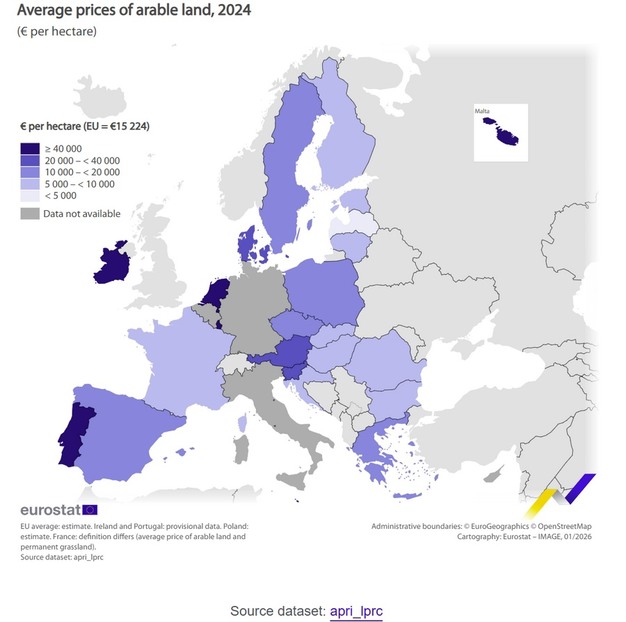 Las cifras se basan en datos de Eurostat sobre precios y arrendamientos de tierras agrícolas en los Estados miembros de la UE.