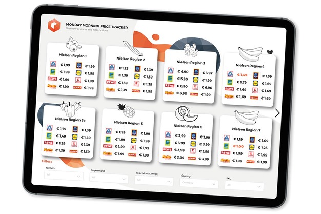 Cada lunes por la mañana, el equipo de Roamler recorre los principales supermercados de Alemania —Lidl, Aldi, Kaufland, Edeka, entre otros— auditando precios, promociones y orígenes de un conjunto fijo de 30 productos. A las 11:00 en punto, ya se dispone de un informe claro y accionable.