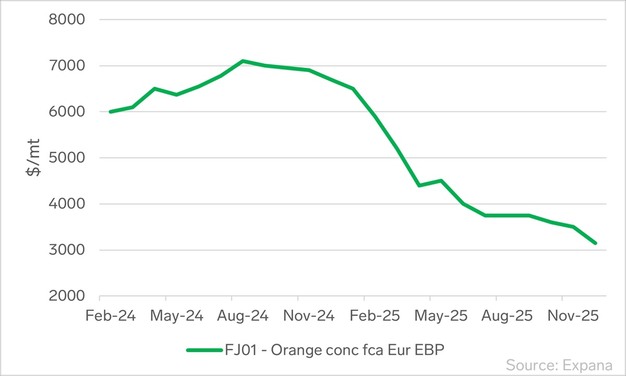 En este contexto, los precios de referencia de Expana para el concentrado de naranja FCA Europa [FJ01] se situaron en diciembre en 3.150 dólares por tonelada métrica. Este nivel supuso un descenso del 10% intermensual y del 53% interanual, reflejando el continuo retroceso desde los elevados niveles de precios observados en las dos temporadas anteriores.