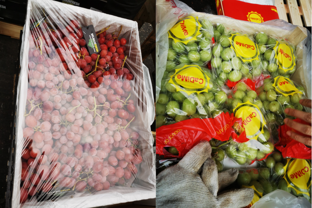 Izquierda: uvas rojas sin semilla Ralli de Australia. Derecha: uvas blancas Autumn Crisp de Perú.