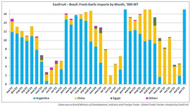 Los exportadores egipcios también aumentaron sus volúmenes durante este periodo. Los envíos se concentraron en junio y julio, coincidiendo con la menor disponibilidad argentina y los retrasos de la cosecha local. La cuota de Egipto en las importaciones de ajo de Brasil superó el 12% en junio y cerró el año en el 2,5%.