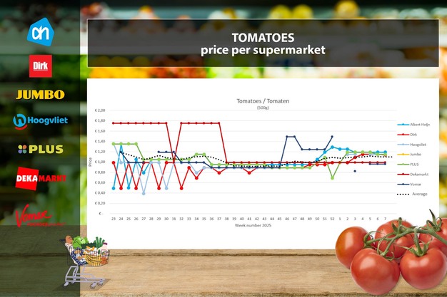 Los datos de precios proceden de Supermarktscanner.nl y se basan en los precios disponibles online en las tiendas web de Albert Heijn, Jumbo, Plus, DekaMarkt, Dirk y Hoogvliet. El precio es una media, incluyendo promociones en curso. Para la comparación de precios no se tiene en cuenta ni el origen ni la calidad, dado que la mayoría de supermercados no aportan estos datos en sus páginas web. Jumbo solo vende tomates en rama en envases de 5 unidades, y no al peso.