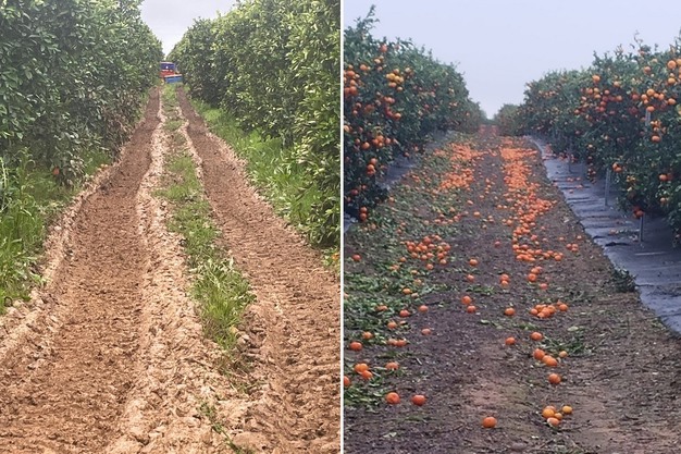"Si bien es cierto que por un lado las lluvias nos han venido bien para que se llenen los acuíferos y podamos disponer de suficiente agua para regar, han tenido un impacto negativo por su cantidad y continuidad, provocando encharcamiento e incluso inundaciones en zonas próximas a los cauces de los ríos", cuenta Miguel Sanz, de la empresa sevillana Naranjas Miguelito. "Además, las fuertes rachas de viento han contribuido a que se desprenda mucha fruta de los árboles".