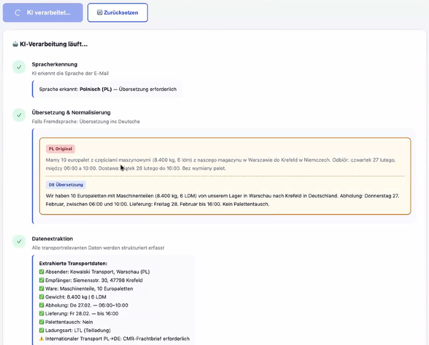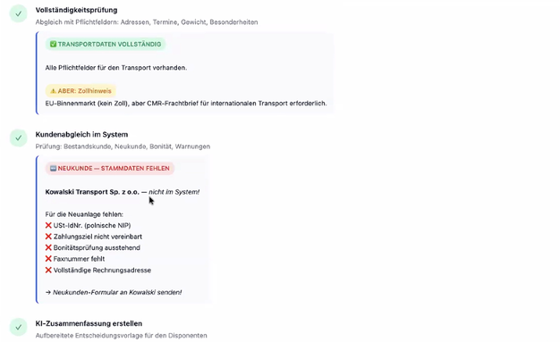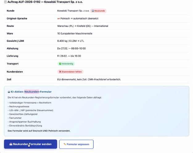 Con la ayuda de Claude AI, Hansult integró varios flujos de trabajo de IA en la base de datos de demostración y utilizó un escenario de ejemplo para explicar cómo la IA podría apoyar el trabajo de los expedidores en el futuro. En este ejemplo, un nuevo cliente de habla polaca había enviado una consulta. La IA procesó el correo reconociendo el idioma, en este caso el polaco, y traduciéndolo al alemán. A continuación, enumera los datos de forma estructurada, comprueba que estén completos con información aduanera y realiza una comparación de clientes en el sistema. Al final, los empleados reciben un resumen con información sobre el estado y pueden enviar el formulario del nuevo cliente en alemán y, por ejemplo, en polaco con un solo clic.