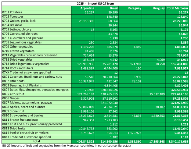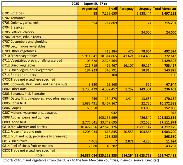 Sobre la base de los totales de los capítulos 07 y 08 de la clasificación arancelaria, la UE-27 habrá exportado en 2025 frutas y hortalizas con un valor de 261,7 millones de euros a los cuatro países del Mercosur. Por otro lado, la UE habrá importado bienes de Mercosur valorados en 1.340 millones de euros. En total, esto supone una balanza comercial negativa de 1.078 millones de euros para la UE. El déficit afecta sobre todo a frutas, frutos secos y frutos de cáscara (el capítulo 08 representa 216,5 millones de euros de exportaciones de la UE, frente a 1.145 millones de euros de importaciones). En lo que respecta a las hortalizas (capítulo 07), la diferencia es menor, pero también sustancial: 45,2 millones de euros de exportaciones frente a 195,0 millones de importaciones.