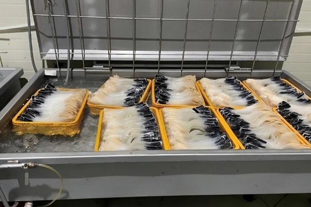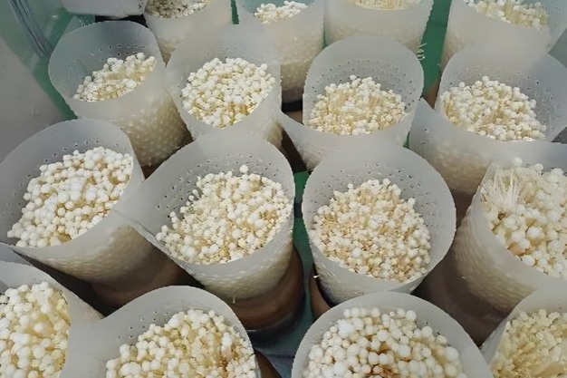 "Operamos un sistema controlado de cultivo en botellas, que incluye la preparación del sustrato, la esterilización, la inoculación, la incubación, la fructificación y la recolección. Los volúmenes de exportación están sujetos a normas adicionales de control de clasificación y envasado. Hay 5 puntos clave principales en el proceso. En primer lugar, la preparación del sustrato (a base de serrín y nutrientes) y el llenado de las botellas; a continuación, la esterilización y el enfriamiento para reducir la contaminación y alcanzar la temperatura de inoculación. Después viene la inoculación con las semillas y la incubación (crecimiento del micelio), seguida de la inducción de la fructificación con temperatura/humedad/CO₂ controlados (el control ambiental afecta mucho a la calidad del enoki). Por último, llega el momento de cosechar, clasificar y envasar, y luego comienza la distribución en cadena de frío".