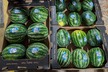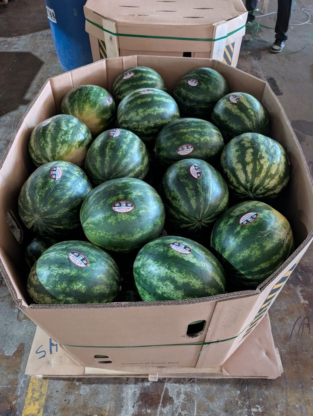 Sandías sin semilla medianas y sandías sin semilla XL, en bins para el mercado estadounidense.
