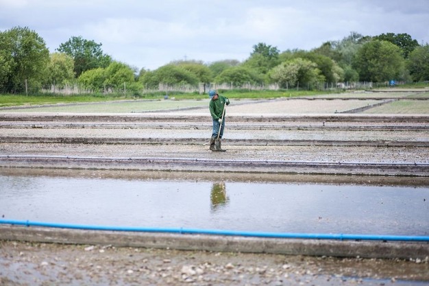 En lo que respecta a la cosecha, las cosas han cambiado un poco, ya que antes se recogía a mano. Hoy en día, 24 horas antes de la cosecha, el cultivo se peina para aplanar las plantas y dejarlas justo por debajo de la superficie del agua. Cuando se llega al final, la otra mitad se peina en la dirección opuesta, lo que hace que el berro tenga dos tonos, un poco como las rayas de un césped cortado. Esta operación hace que el berro vuelva a subir de forma organizada y con el tallo ligeramente doblado, lo cual facilita la cosecha, ya que la cosechadora se desplaza en dirección opuesta a la del cultivo peinado y corta un brote uniforme.