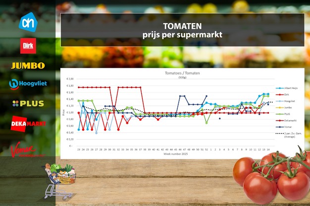 Los datos de precios proceden de Supermarktscanner.nl y se basan en los precios disponibles online en las tiendas web de Albert Heijn, Jumbo, Plus, DekaMarkt, Dirk y Hoogvliet. El precio es una media, incluyendo promociones en curso. Para la comparación de precios no se tiene en cuenta ni el origen ni la calidad, dado que la mayoría de supermercados no aportan estos datos en sus páginas web. Jumbo solo vende tomates en rama en envases de 5 unidades, y no al peso.