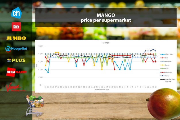 En la semana 14, Dirk (por segunda semana consecutiva) y DekaMarkt han tenido los mangos de oferta, con precios de 1,49 euros por unidad. En el resto de supermercados, los precios de venta siguen rondando los 2 euros. Vomar es el más caro, con 2,19 euros.