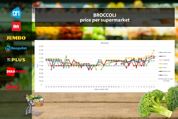 En la semana 14 se han observado notables variaciones en el precio del brócoli. Albert Heijn y Jumbo han aumentado su precio fijo en 30 céntimos, mientras que Dirk, Hoogvliet y Vomar lo mantienen al mismo nivel. El resultado es una diferencia de 54 céntimos de euro entre el precio más bajo y el más alto. El precio medio semanal ha subido 9 céntimos, hasta 1,48 euros.
