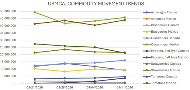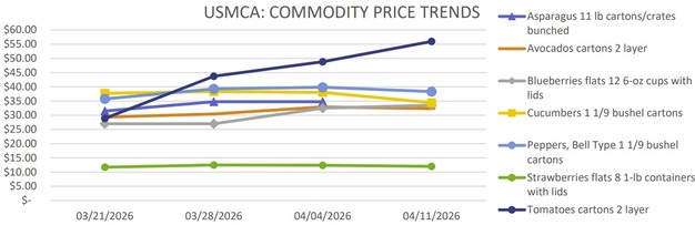 La oferta de México a través de Texas y Nogales es ajustada, con comercio activo a muy activo y precios altos en la mayoría de los calibres. Los tomates madurados tienen precios altos por la poca disponibilidad. Se espera que el movimiento a través de Otay Mesa aumente a medida que más proveedores comiencen a enviar, aunque los volúmenes actuales siguen siendo limitados debido a compromisos previos.