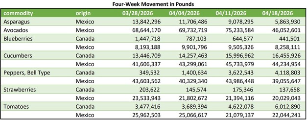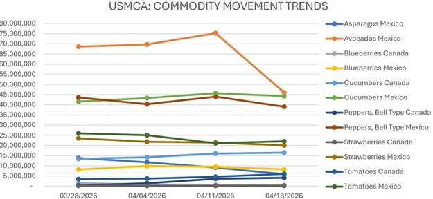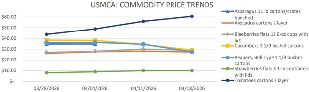 La oferta de México que cruza por Texas se mantiene estable pero limitada, con comercio activo y precios ligeramente altos. Los volúmenes de Nogales están disminuyendo con una disponibilidad muy ajustada, mientras que se espera que los envíos de Otay Mesa aumenten a medida que más proveedores entren en el mercado.