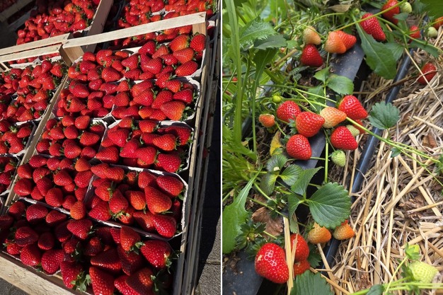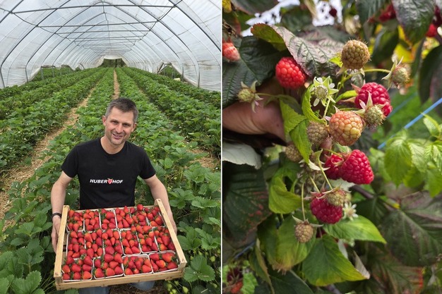 Jörg Huber en el túnel de fresas. A partir de mediados de mayo, también ofrecerá frambuesas de su propio cultivo (derecha).